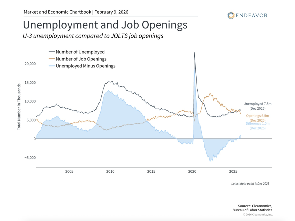 Adding to investor concerns is a labor market that has weakened since the middle of 2025. The latest data published by the Bureau of Labor Statistics showed that job openings fell to their lowest level since 2020 in December. At its peak, there were more than two job openings per job seeker, but now the ratio is less than one, with about 6.5 million openings for 7.5 million unemployed individuals. Meanwhile, a report by Challenger, Gray & Christmas showed that job cuts soared to 108,435 in January, a 118% year-over-year jump and the highest level for the month since 2009.