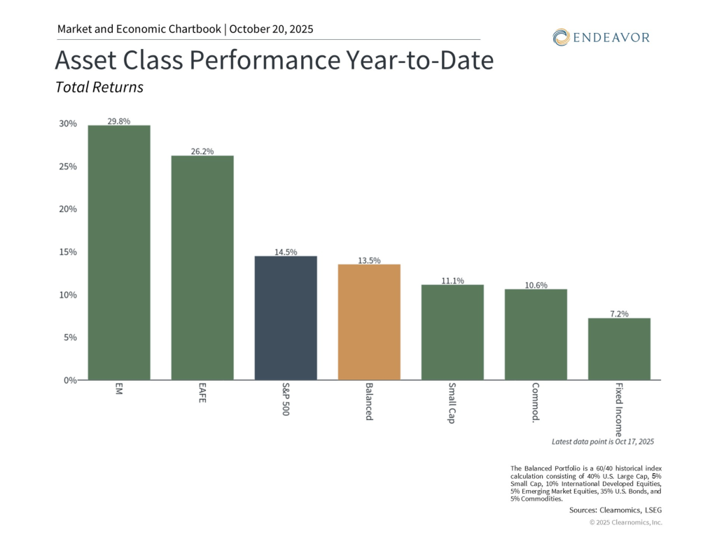 The current gold rally, which began in 2024, is intertwined with strong performance across many assets, including artificial intelligence stocks, such as the Magnificent 7, international stocks, bonds, and cryptocurrencies. The accompanying chart shows that many asset classes have contributed to portfolio returns this year. While gold has certainly performed well, there will always be individual stocks and other assets that perform well in a particular year.