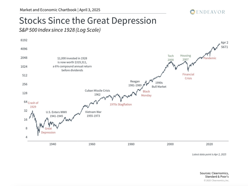 It’s important in times like these to remember that markets can be fragile in the short run but are resilient in the long run. Over the past century, markets have experienced significant global economic shifts, including wars, recessions, bubbles, pandemics, political change, and technological revolutions.