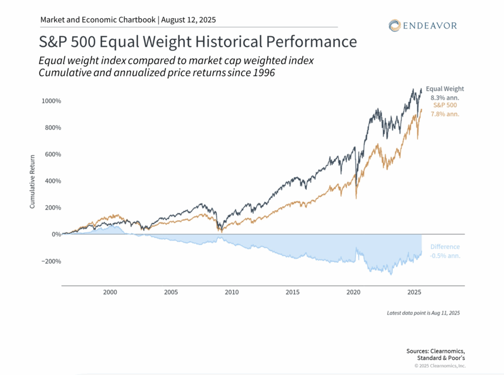 For perspective, consider the equal-weighted S&P 500 shown in the chart above, which gives the same importance to each company regardless of size. This approach has historically provided different return patterns than the standard market-capitalization weighted index, sometimes performing better when large companies struggle.